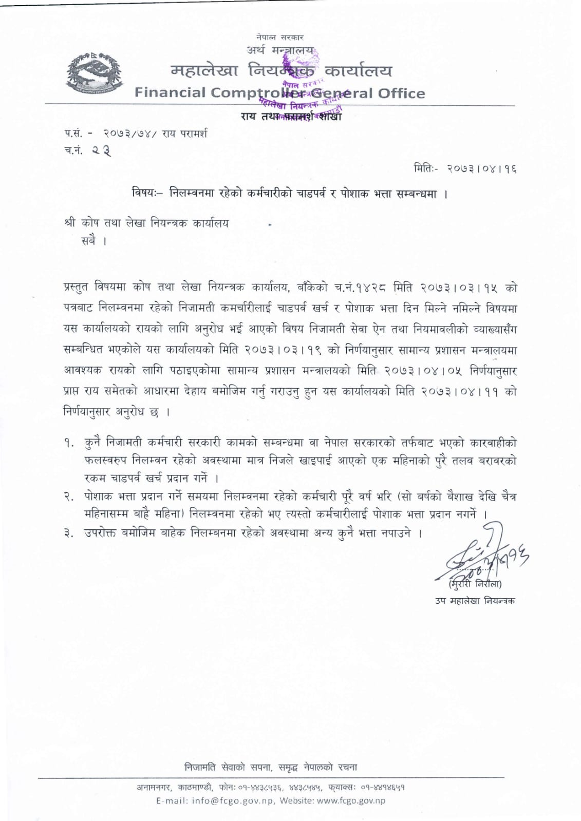 निलम्बनमा परेका कर्मचारीको चाडपर्व र पोशाक भत्ता सम्बन्धमा ।