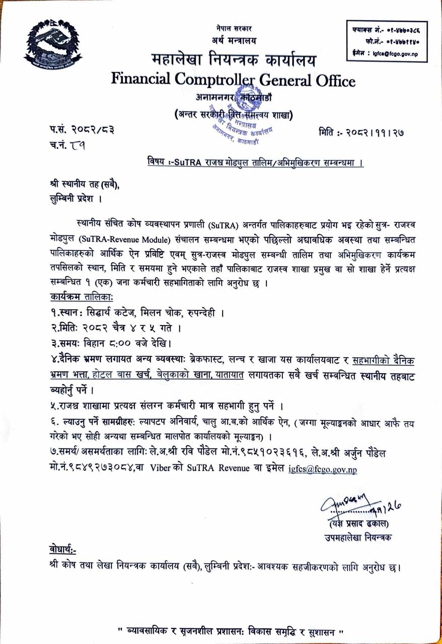 SuTRA राजश्व मोड्यूल तालिम/अभिमूखिकरण सम्बन्धमा ।